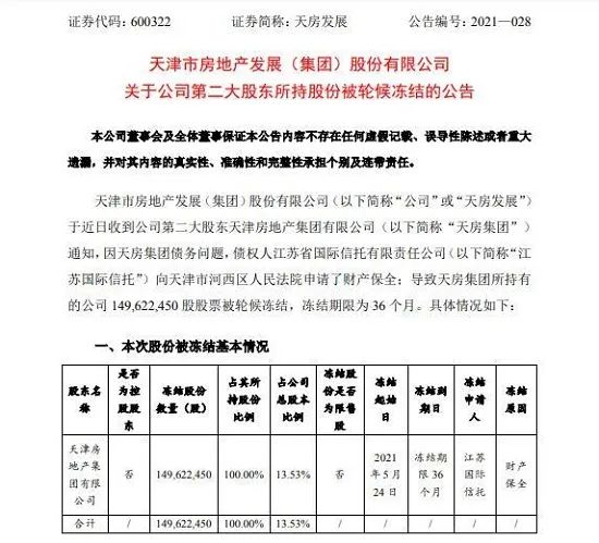 近日,天房发展公告,公司第二大股东天房集团持有的公司1.496亿股股票被轮候冻结,冻结期限为36个月,冻结申请人为江苏国际信托。