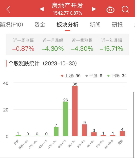 今日,房地产开发板块整体涨幅0.87%,其中56只股票上涨,6只股票平盘,34只股票下跌。