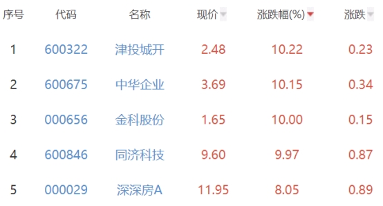其中,津投城开、中华企业、金科股份、同济科技、深深房A位列板块涨幅榜前五位,涨幅分别为10.22%、10.15%、10.00%、9.97%、8.05%。