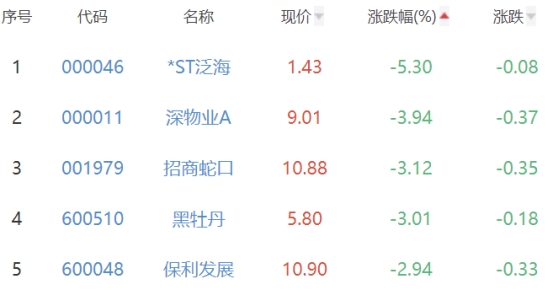 *ST泛海、深物业A、招商蛇口、黑牡丹、保利发展位列板块涨幅榜后五位,涨幅分别为-5.30%、-3.94%、-3.12%、-3.01%、-2.94%。