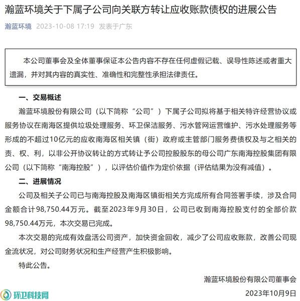 瀚蓝环境(600323)10月8日发布公告,宣布下属子公司已向广东南海控股集团有限公司(以下简称“南海控股”)转让应收账款债权,总额合计98,750.44万元,目前已收到全部款项。