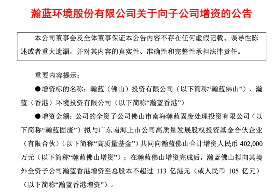 瀚蓝环境在2024年7月23日发布了增资公告。公告内容显示,公司的全资子公司—佛山市南海瀚蓝固废处理投资有限公司将与广东南海上市公司高质量发展股权投资基金合伙企业一同对瀚蓝佛山进行增资,增资金额总计为人民币40.2亿元。在这次瀚蓝佛山的增资工作完成后,瀚蓝佛山计划将其资本扩展至不超过113亿港元(折合约人民币105亿元),这一资金将用于向其境外全资子公司—瀚蓝香港进行注资。