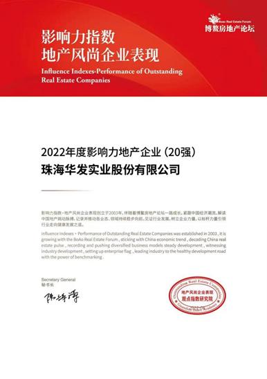 8月8日,以“创造未来寻求破解之道”为主题的2022博鳌房地产论坛在广州拉开帷幕。9日晚,影响力指数·地产风尚大奖隆重颁布,华发股份凭借稳健经营及良好的市场认可,荣获“2022年度影响力地产企业(20强)”奖项。