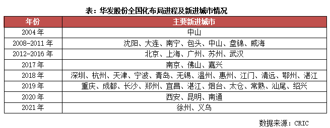 2008-2011年,异地扩张突破期,走出珠三角区域。该阶段企业在“立足珠海,面向全国”战略目标指引下,走出珠海、中山市场,开拓了包头、大连、南宁、沈阳、盘锦等潜力二三线城市,也拉开全国化布局序幕,整体扩张进程仍谨慎保守。