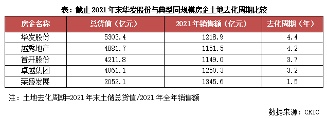 在“按需定投”策略以及快周转模式下,华发股份土地去化周期从高位回落。根据克而瑞《2021年中国房企总土储货值排行榜TOP100》,截至2021年末,华发股份总土储货值5303.4亿元,土地去化周期4.4年,而2017年该数值为10.8年。但与典型同规模房企相比,总土储货值与土地去化周期都位于前列,具备一定比较优势,将为业绩实现提供相对充足的保障。