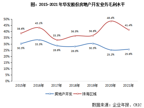 近年来,行业盈利持续下行探底,房企利润率普降态势显著,在此大势下,华发股份营收与利润规模仍维持增长,利润率有所波动,但整体可控。2021年,整体毛利率为25.8%(其中房地产开发业务毛利率为25.6%)、净利率为9.1%,较2020年均有所反弹,展现出良好的经营韧性。