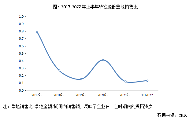 2018年开始,行业进入下行调整周期,市场不确定性增加,华发股份的投拓策略应势转向“按需定投”。以拿地销售比(拿地金额/销售额)进一步衡量企业的投资力度,可以发现,2018、2019年,拿地销售比连续大幅下行,投资态度转向谨慎。2020年在千亿目标指引下,企业加大补货力度,拿地销售比达到近5年小峰值,但也远低于2017年。2021年至今,企业在珠海、上海、杭州、成都等地相继补仓,随着财务端、投资端政策调控收紧,叠加市场遇冷,投资风险积聚,企业拿地销售比一直维持在0.15以下低位区。