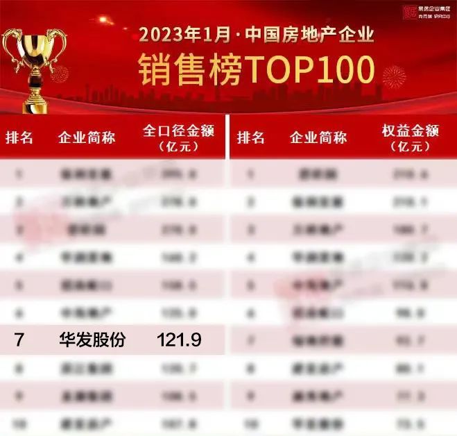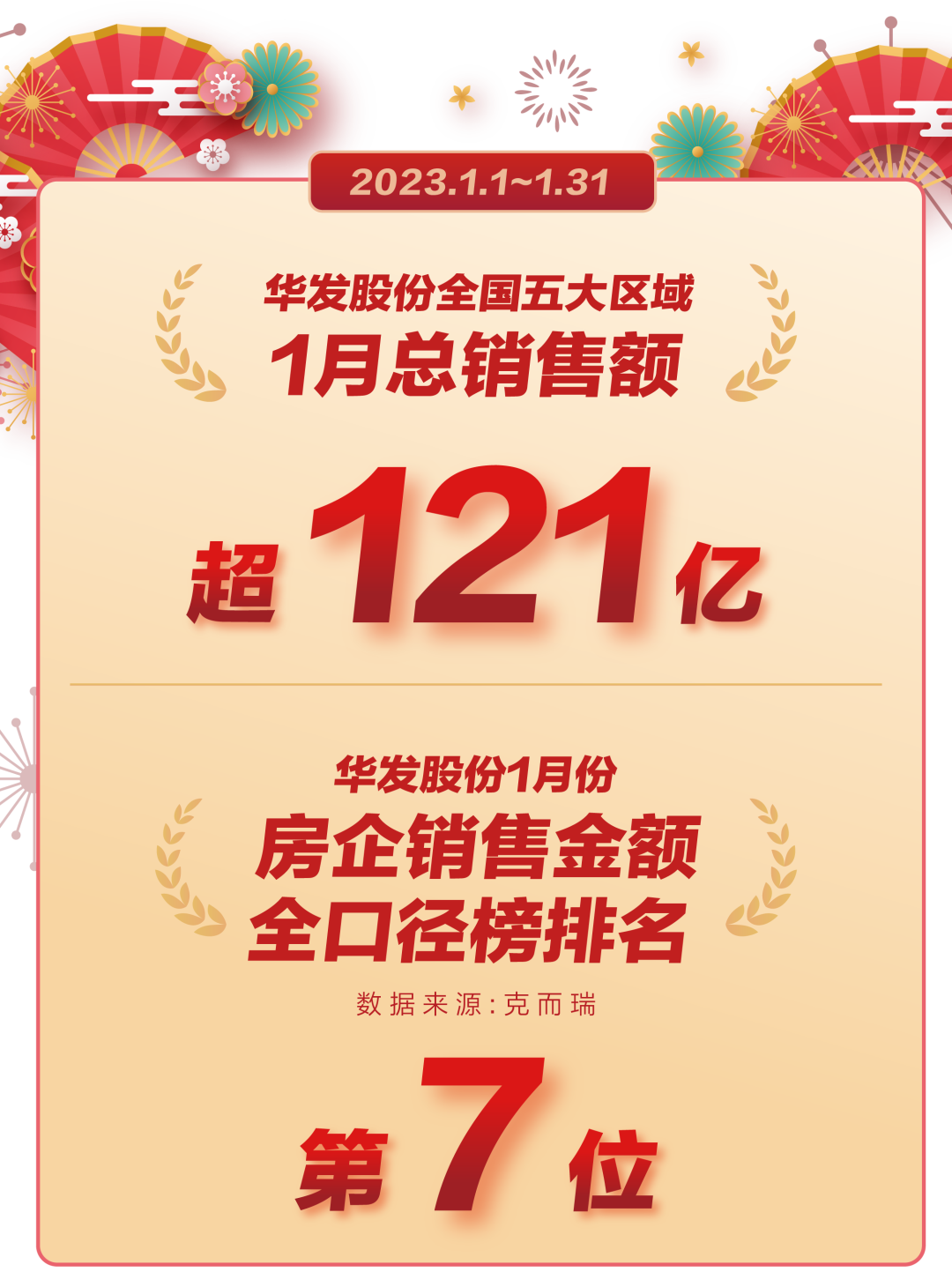 在股份经营班子的坚定领导下,华发股份“起步即冲刺”,在百强房企1月份销售全口径金额同比下降32.2%,环比下降47.7%,整体销售仍然低迷的窘境下,据克而瑞发布的2023年1月中国房地产企业销售业绩榜单显示,华发股份以全口径销售额121.9亿创历史新高,位列榜单第7位,榜单销售额同比增长19%,顺利实现开门红,月度一举跻身行业第一梯队,进一步彰显了华发股份强劲的发展韧性。