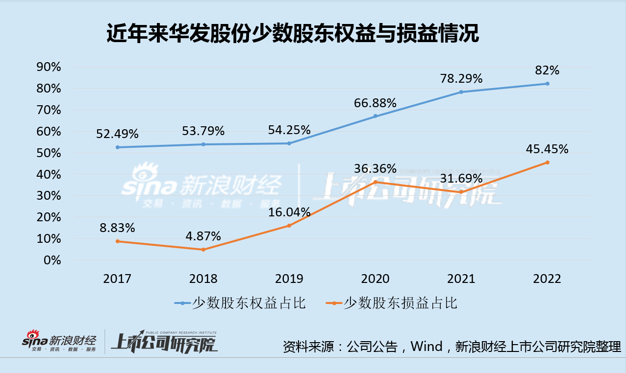 年报显示,2022年华发股份实现营业收入591.90亿元,同比增长15.51%,同期净利润47.26亿元,同比增长1.06%。其中,归属于上市公司股东的净利润25.78亿元,同比下降19.31%,而另一方面,少数股东损益进一步增长44.94%至21.48亿元。