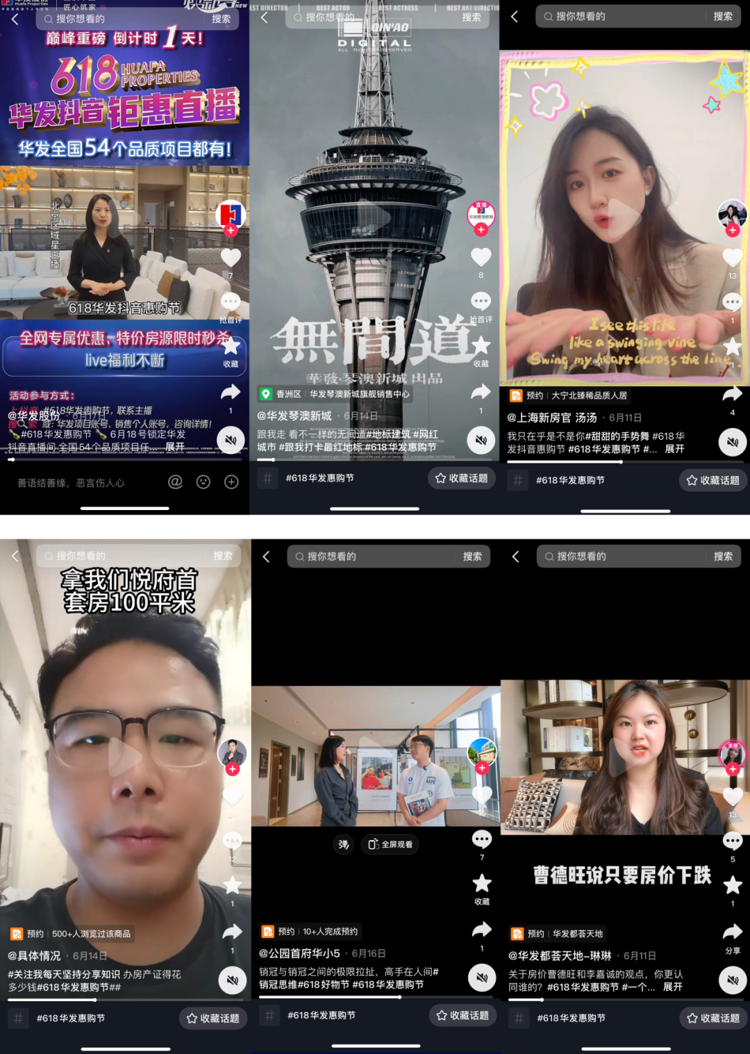 在“华发618抖音惠购节”活动中可以看到,华发股份的抖音矩阵主要包括了官方品牌账号和销售个人IP账号两大体系,其中官方品牌账号体系是从华发股份总部层面到各大区级城市设置账号,销售个人IP账号体系则通过项目、销售层面设置账号,并结合华发股份统一的营销主题,以独具个人风格特色的短视频、直播等方式输出。