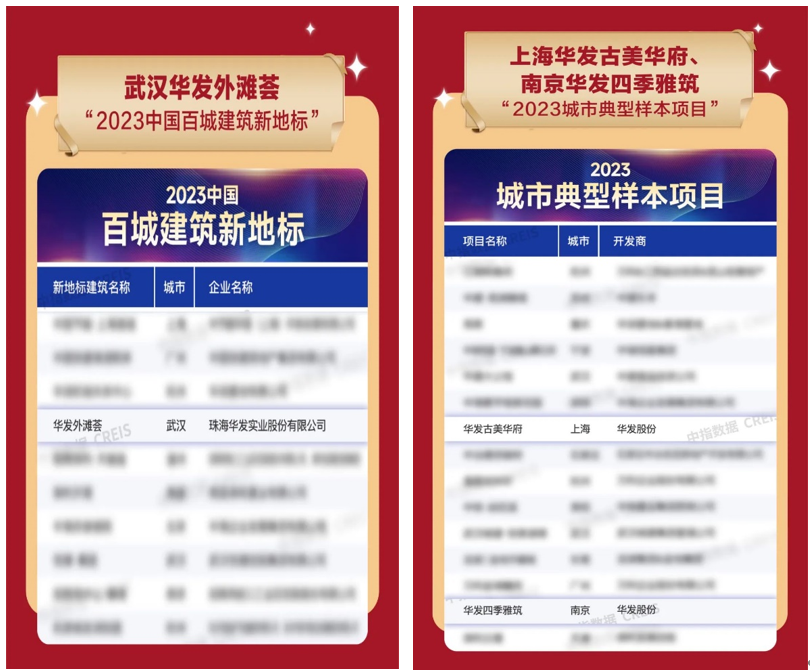近日由北京中指信息技术研究院主办的“中房指数2023房地产市场趋势报告会”在北京召开,并颁发了多个重磅大奖。华发股份凭借过硬的产品品质和实力,荣获“中国房地产产品力优秀企业”第8名。多个项目获得行业权威机构认可,武汉华发外滩荟项目荣获“2023中国百城建筑新地标”,南京华发四季雅筑、上海华发古美华府获评“2023城市典型样本项目”。