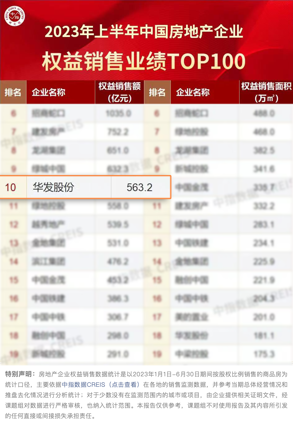 近年来,华发股份经营业绩保持稳向好的发展态势,2022年实现销售收入1202.41亿元,连续三年稳居千亿阵营。此外,中指研究院公布的2023上半年中国房地产企业销售业绩排行榜显示,华发股份上半年权益销售额为563.2亿元,位列第10名。在行业面临复苏放缓、去化周期增长的严峻背景下,华发股份仍保持优秀的推盘去化能力,平稳穿越行业周期。