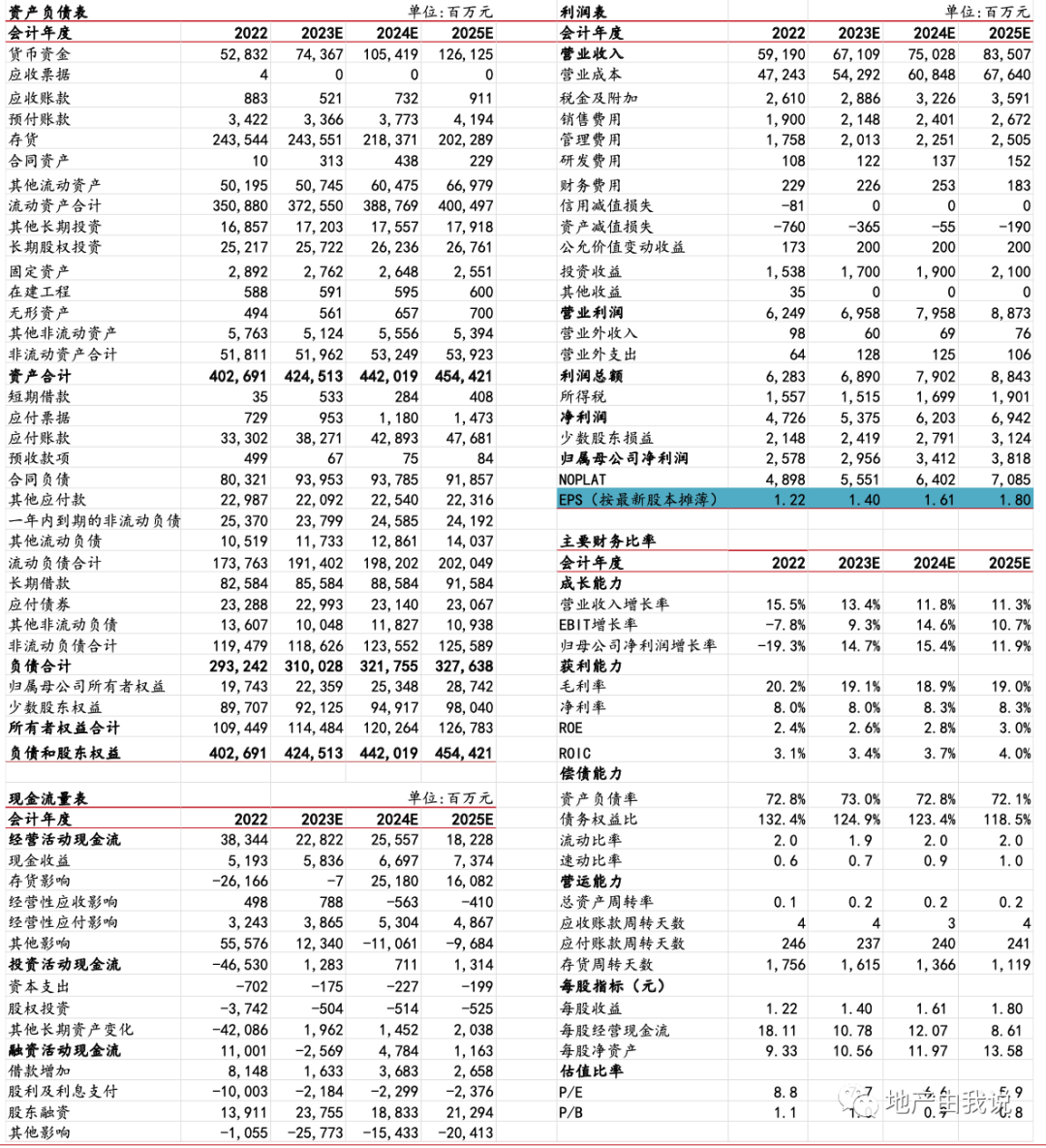 2023年上半年公司收入增速高于净利润主要因为:1)因房地产市场调整,上半年公司综合毛利率由2022年同期的21.42%下降2.57个百分点至18.85%;2)报告期内公司投资净收益由去年同期的3.84亿降至2.45亿;3)所得税由去年同期的8.19亿增至10.37亿;4)少数股东损益由去年同期的4.27亿增至6.06亿。但截至报告期末,公司账面合同负债(主要为预收房款)达990.37亿,是2022年总收入的1.67倍,随着未来项目的陆续交付,合同负债将结算为营业收入,有望推动后续业绩的增长。