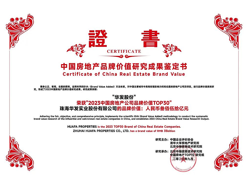 华发股份的品牌声势也随着“七力”提升而上涨。在9月14日中国房地产品牌价值研究成果发布会上,华发股份以350亿元获评全国品牌价值榜单第六位。