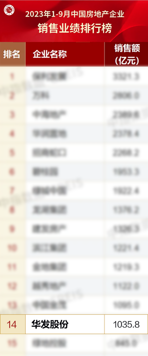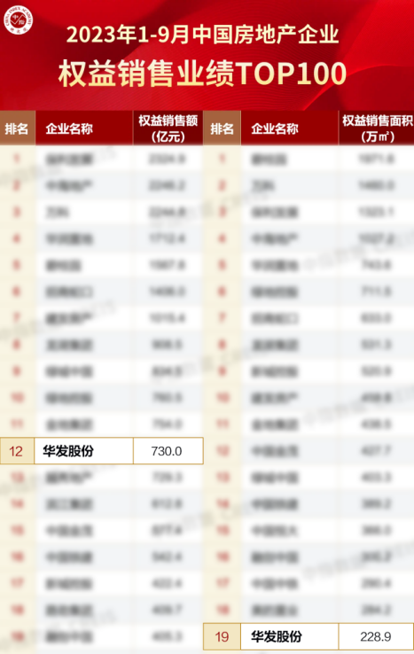 9月,随着“认房不认贷”等楼市政策的实施,房企销售迎来回升。公司积极把握政策窗口期和“金九银十”关键节点,加快推盘节奏,多措并举促销售,销售成果再创佳绩。中指研究院发布的2023年1-9月中国房地产企业销售榜单显示,华发股份全口径销售额1035.8亿元,位列第14名,比往年提前了2个月左右实现千亿业绩,继续稳居“千亿俱乐部”;以权益销售额730.0亿元位列第12名。目前市场正处于“金九银十”销售旺季,依此势头,华发股份全年销售业绩将有望再创新高。