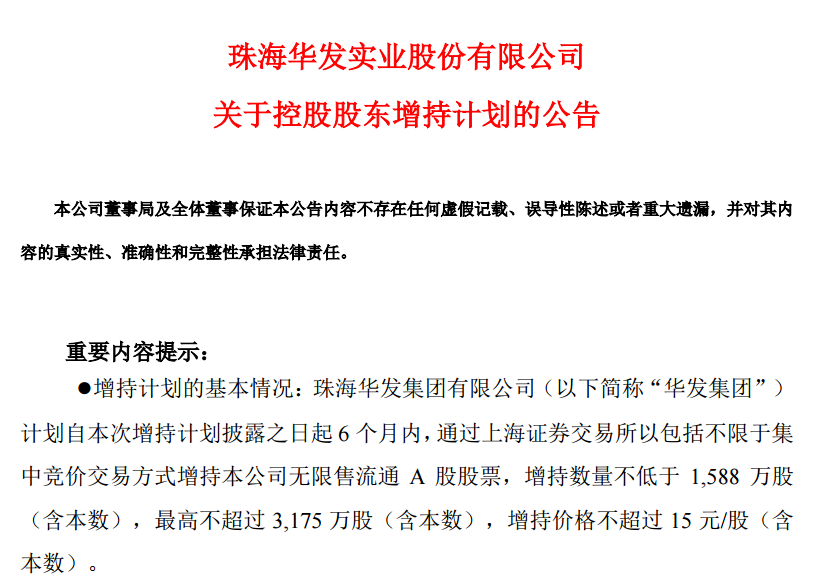 9月26日晚间,华发股份发布控股股东珠海华发集团有限公司(以下简称“华发集团”)增持计划公告,华发集团计划自本次增持计划披露之日起6个月内,通过上海证券交易所以包括不限于集中竞价交易方式增持本公司无限售流通A股股票,增持数量不低于1588万股(含本数),最高不超过3175万股(含本数),增持价格不超过15元/股(含本数)。