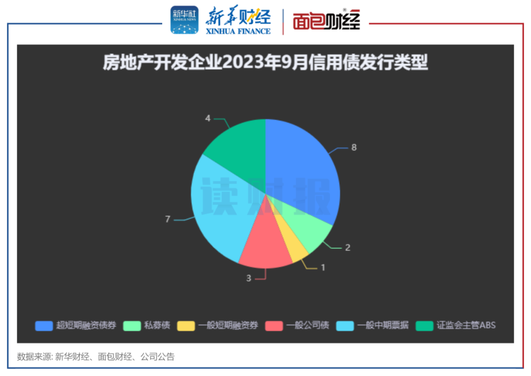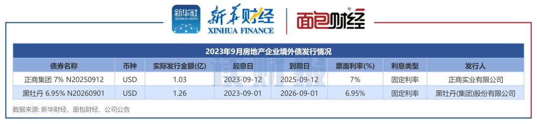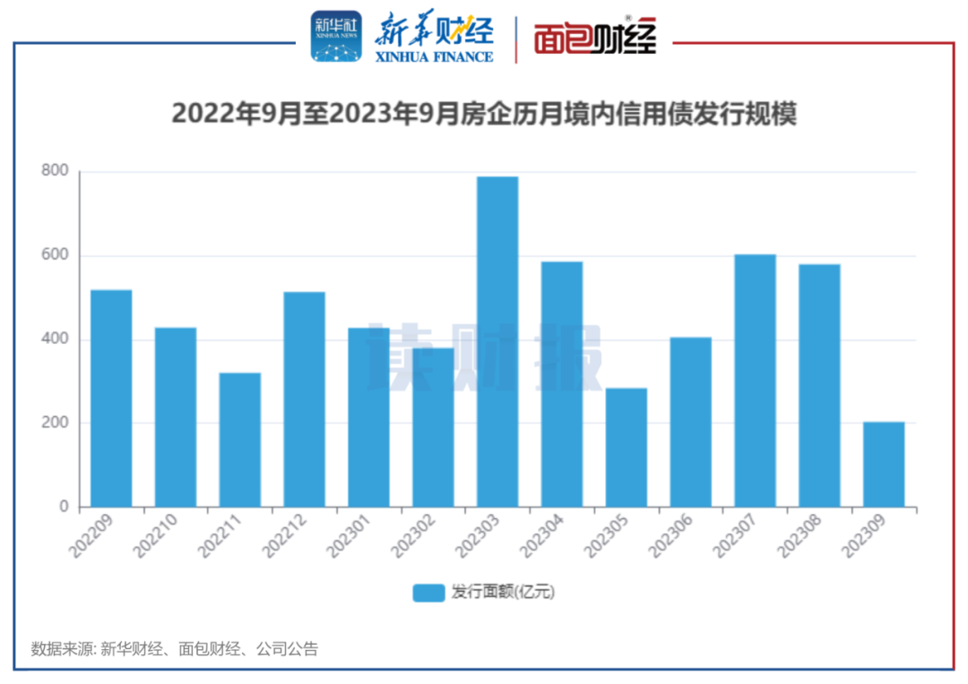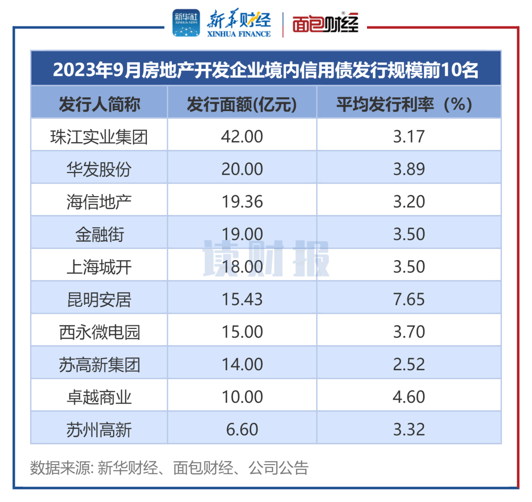 新华财经和面包财经研究员统计了国内房地产开发企业2023年9月境内信用债和境外债的发行情况。