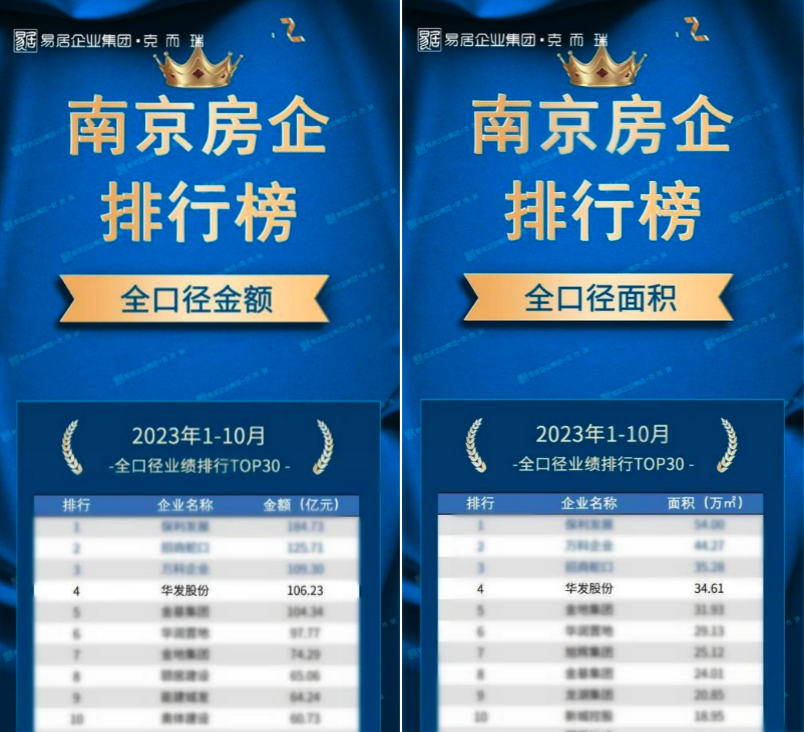 2023年1-10月,华发股份在南京以106.23亿的销售额与34.61万㎡的销售面积,双双位列克而瑞南京房企全口径销售排行榜第四位,稳居百亿梯队。其中中秋国庆双节期间,华发更是以约7.75亿(数据来源案场统计)的热销成绩霸屏南京,实力出圈。其中华发·四季雅筑热销约1.2亿;紫京四季热销约1.1亿;紫麒府热销约8000万;万象天地热销约6000万(数据来源案场统计),多项目屡创现象级热度,业绩遥遥领先。这一成绩不仅彰显了华发在南京房地产市场的实力和影响力,也反映了客户对华发产品和服务的高度认可与信赖。
