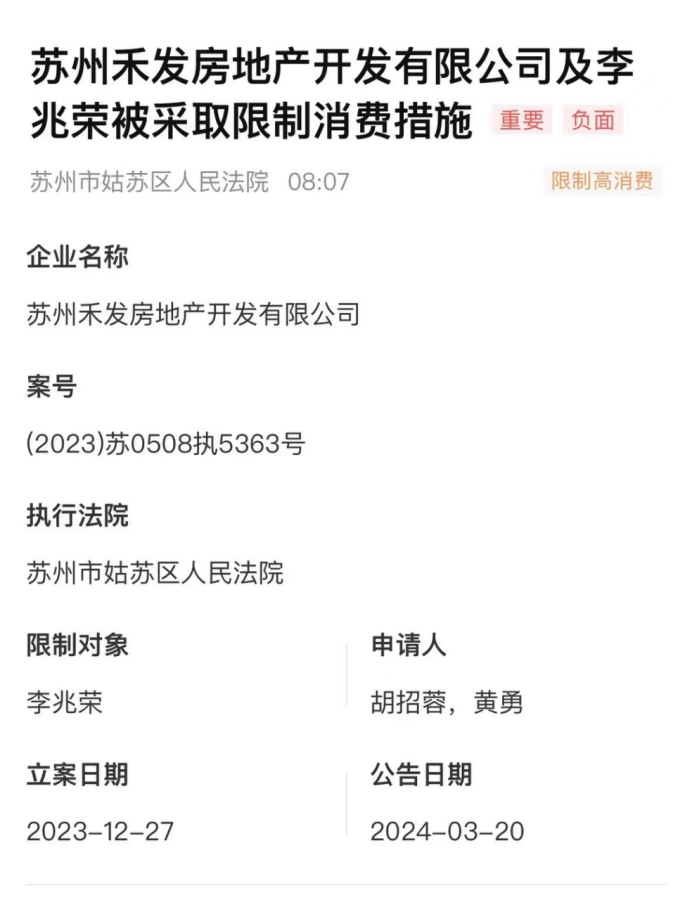 日前,苏州禾发房地产开发有限公司及其法人代表李兆荣的一则限消令引起了作者的注意。