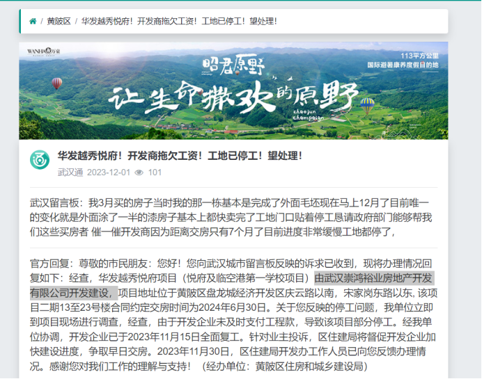 至于项目停工问题,则是来自于武汉的业主投诉。
