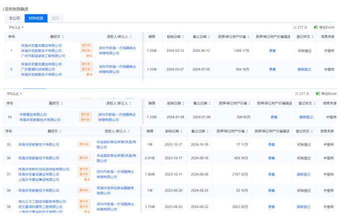 据企业预警通的信息显示,自去年10月份以来,珠海华发新科技投资控股有限公司、珠海华发景龙建设有限公司、珠海华发数智技术有限公司等公司的应收账款融资出现了展期情况,金额大的2000多万,少的只有300多万。