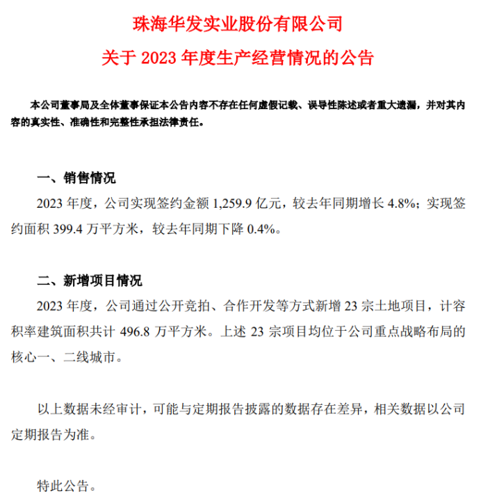 据2023年度生产经营情况公告显示,去年全年度华发新增了23个项目。而今年前2月,据克而瑞地产的信息统计,华发股份未进入拿地百强,拿地百强的入围线是拿地金额2.7亿元,换言之,今年前2月华发股份极有可能没有拿地。
