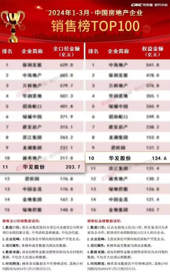 据克而瑞发布的2024年1-3月中国房地产企业销售榜数据显示,华发股份全口径销售金额203.7亿元,排名第11位,稳居房企前列;以权益销售金额134.6亿元,位列权益销售榜第10位。在当前日益激烈的市场竞争中,华发股份凭借其出色的产品实力再次获得了市场的认可,这不仅展示了公司强大的市场影响力,也凸显了其在行业竞争中的核心优势。