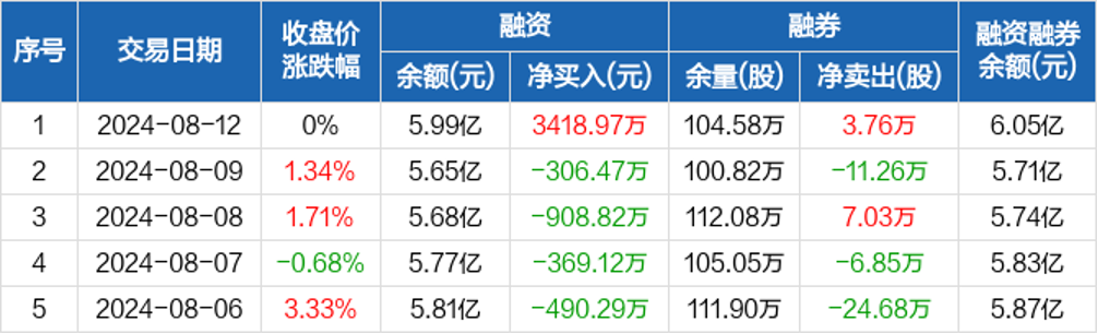 融资方面,当日融资买入5616.97万元,融资偿还2198万元,融资净买入3418.97万元,净买入额两市排名第17。融券方面,融券卖出20.13万股,融券偿还16.37万股,融券余量104.58万股,融券余额630.62万元。融资融券余额合计6.05亿元。