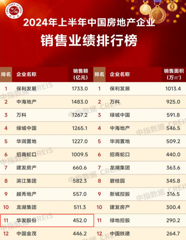 上半年,房地产市场迎来了深刻变革期,央行推出一揽子新政为房地产注入新活力,7月召开的二十届三中全会为行业未来发展指明新方向。在这样的环境下,华发股份凭借其敏锐的市场洞察力,及时调整战略部署,优化销售策略。上半年,华发股份实现销售额452亿元,位列中指研究院销售榜单第11位,相比2023年同期上升3位。