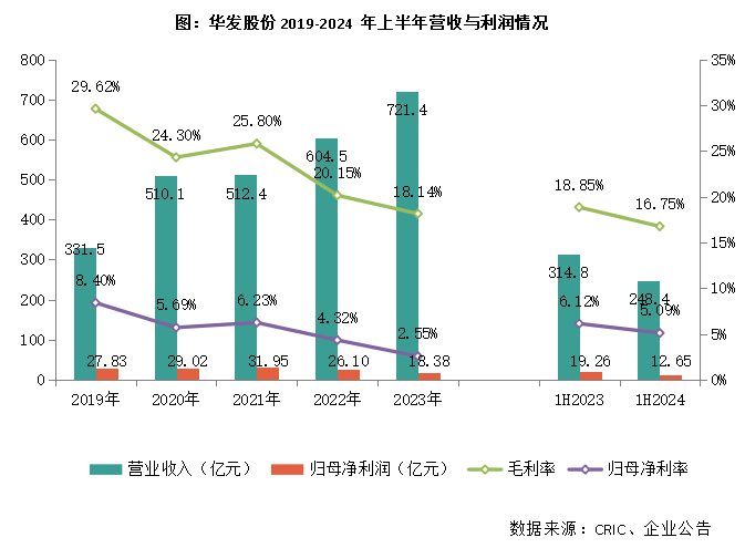 2024年上半年,华发股份实现签约销售金额452亿元,较去年同期下降41%;销售面积166.8万平方米,较去年同期下降 33%。根据克而瑞榜单显示,操盘口径销售金额位居行业TOP10,全口径销售额位居行业第11位,较2023年底提升3个位次。