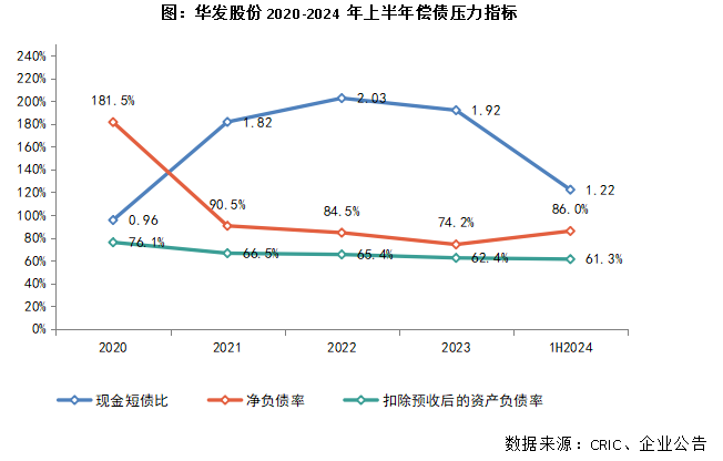 截至2024年上半年,华发股份持有货币现金348.8亿元,较2023年末减少24.7%,其中包括受限制现金6.9亿元。总有息负债1503.55亿元,其中长期负债占比超八成。从“三条红线”指标来看,现金短债比为1.22;净负债率为86%,较2023年末上升11.8个百分点;扣除预收账款后的资产负债率61.3%,较2023年末下降1.1个百分点,继续保持“绿档”水平,债务结构较为稳健。