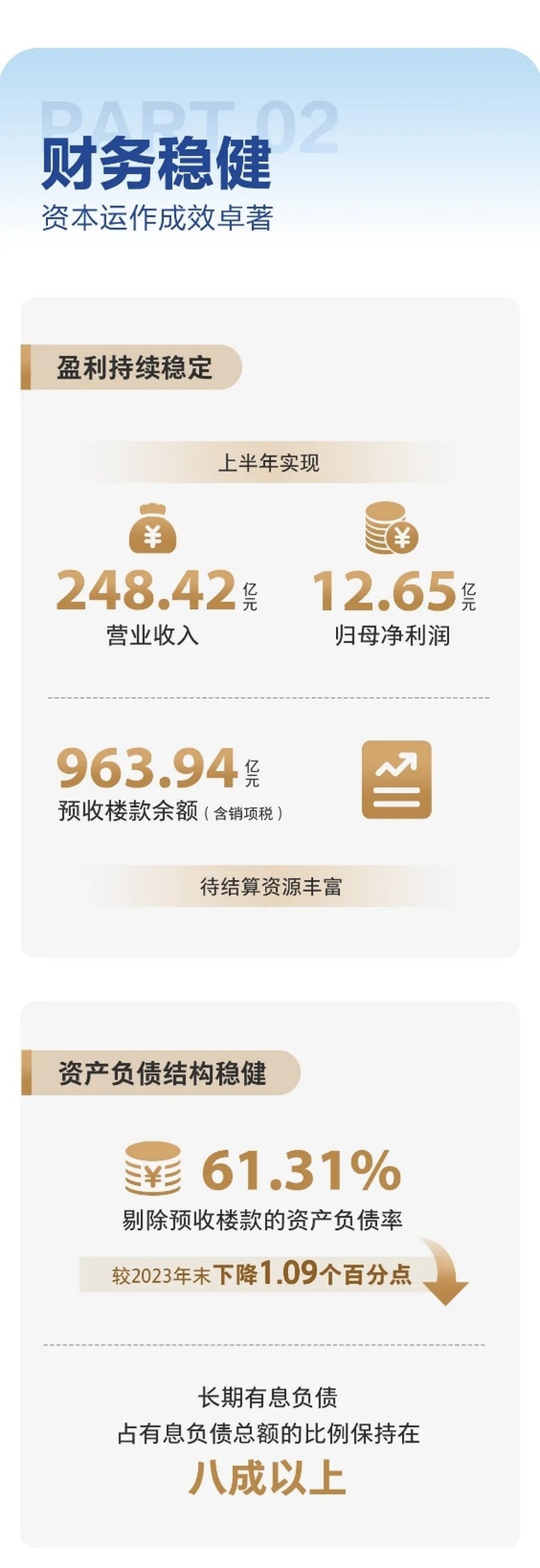在行业普遍营收规模增长动力不足、利润水平承压的被动局面下,华发股份依然保持了强劲且稳定的盈利能力。同时,华发股份不断加强现金流管理,严守安全防线。截至6月末,华发股份剔除预收款的资产负债率61.31%,较2023年末下降1.09个百分点,长期有息负债占有息负债总额的比例保持在八成以上,持续保持稳健的资产负债结构。