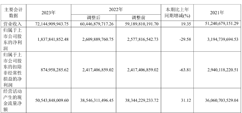 2023年,华发股份实现营业收入721.45亿元,同比增长19.35%;归属于上市公司股东的净利润18.38亿元,同比下降29.58%;归属于上市公司股东的扣非净利润8.75亿元,同比下降63.81%;经营活动产生的现金流量净额为505.44亿元,同比增长31.12%。