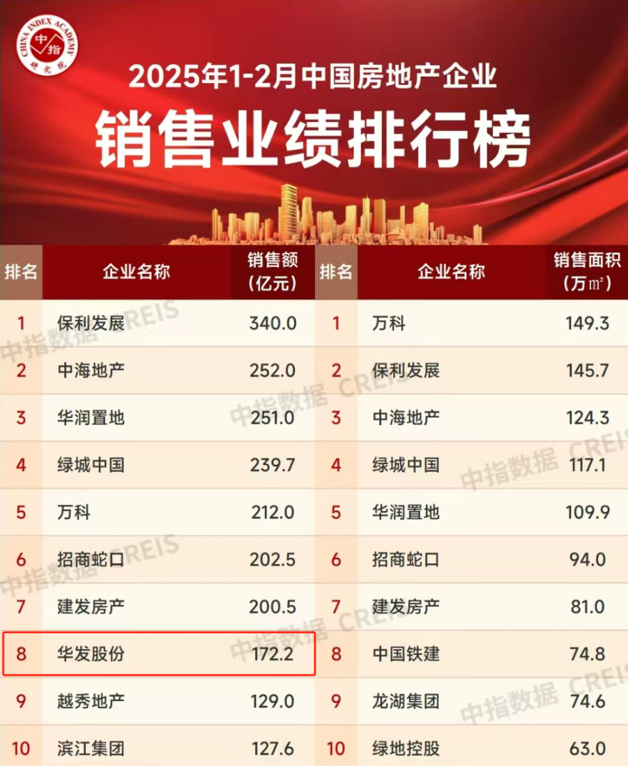 得益于销售持续取得突破,华发股份以1054.4亿元的全口径销售金额跻身2024年中指研究院房地产销售业绩排行榜TOP10,同比提升4位,连续5年稳居千亿阵营,跻身行业第一梯队。而在2025年1-2月,华发股份更是喜迎开门红,以全口径销售额172.2亿,跻身中指研究院全国房企销售榜TOP8。