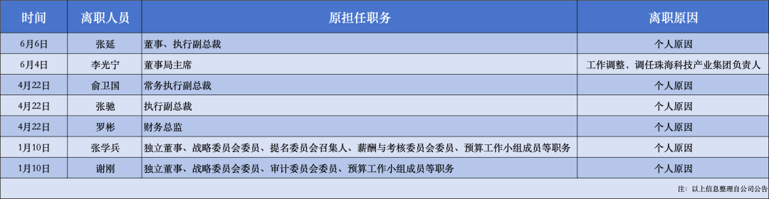 具体来看,今年1月,张学兵、谢刚二人因个人原因辞任独立董事、战略委员会委员等职位;4月,财务总监罗彬、执行副总裁张驰以及常务执行副总裁俞卫国皆以个人原因为由离职;6月4日,董事局主席李光宁因调任珠海科技产业集团负责人,辞去在华发股份的所有职务……