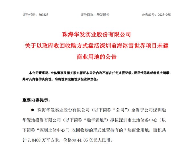 据公告披露,公司子公司融华置地收到深圳土储中心发来的《市土地储备中心关于协商收回收购前海冰雪世界项目7块商业用地有关事宜的函》(深土储函〔2025〕102号),深圳土储中心拟以 44.05亿元人民币(含政府本次收回收购承担的契税)收回收购融华置地持有的前海冰雪世界项目7块商业用地。