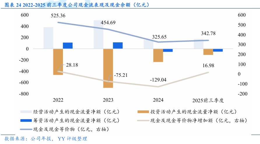 财务情况:净利润下滑,主要系毛利率下滑和资产减值,后续仍应关注资产减值风险。现金流方面,2022-2024年现金流净流出, 2025年前三季度现金及现金等价物净流入16.98亿元。债务方面,表内有息债务规模相对稳定,债务压力边际上升,融资渠道上对股东支持更为依赖,平均融资成本有所压降但仍较高;表外仍存在“明股实债”和员工代持平台,将估算的明股实债规模以及对合联营企业担保余额计入有息债务,2025年6月末净负债率达到118%左右,实际杠杆水平较高。