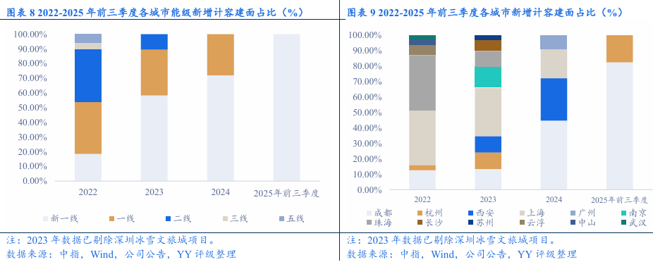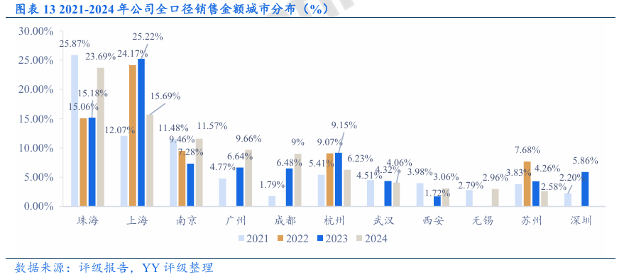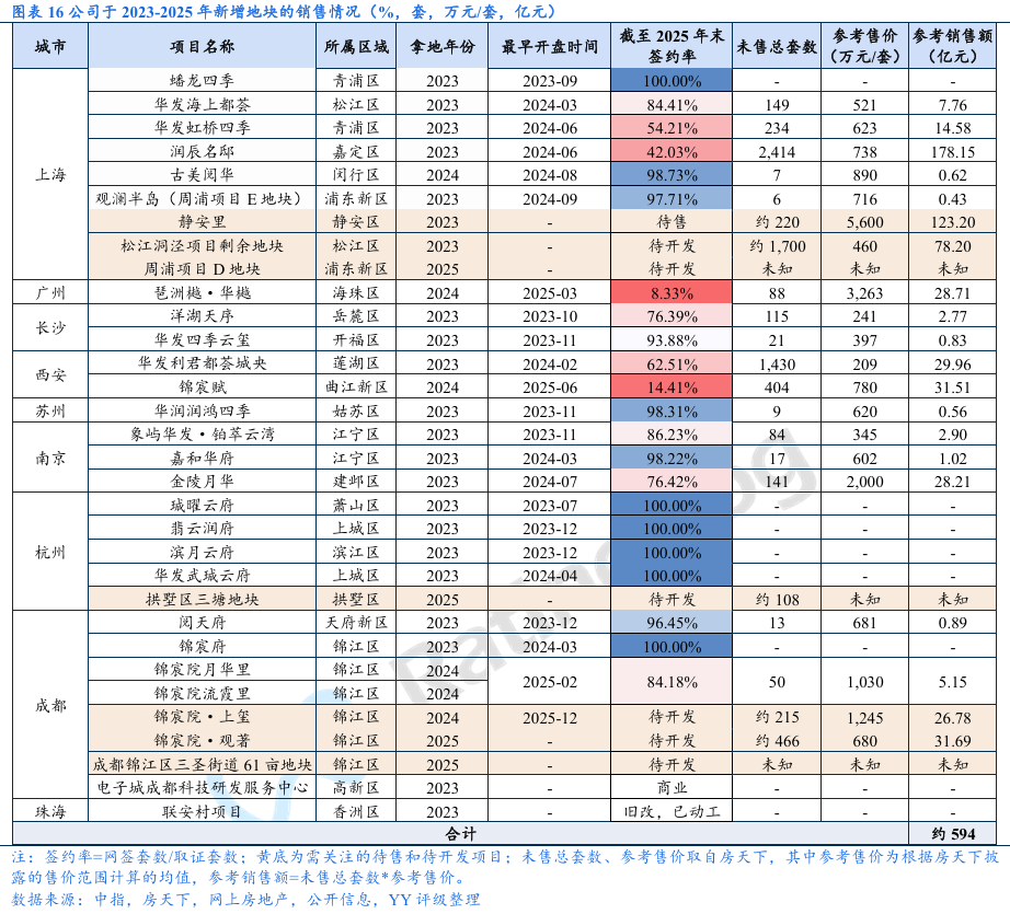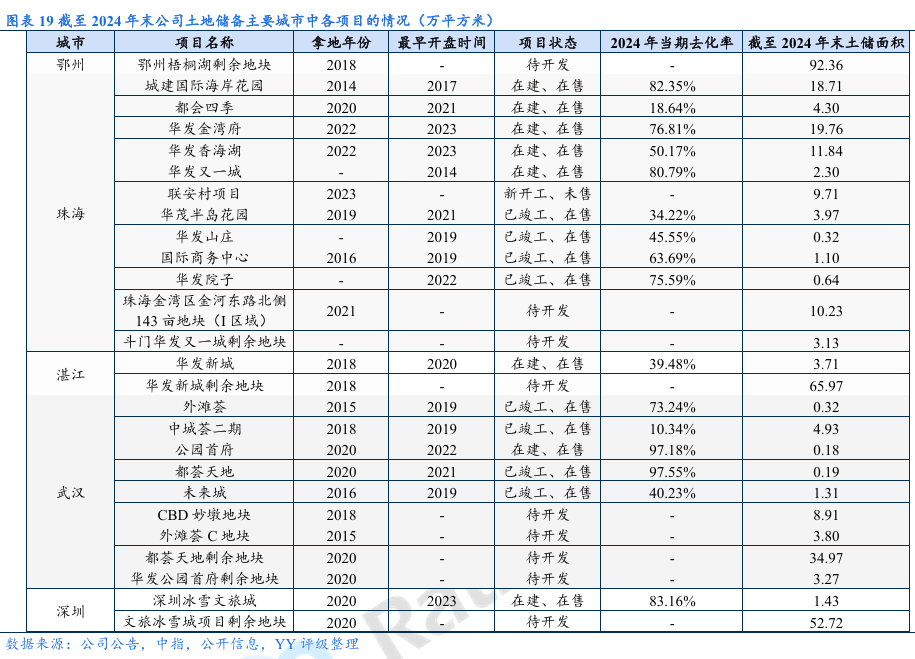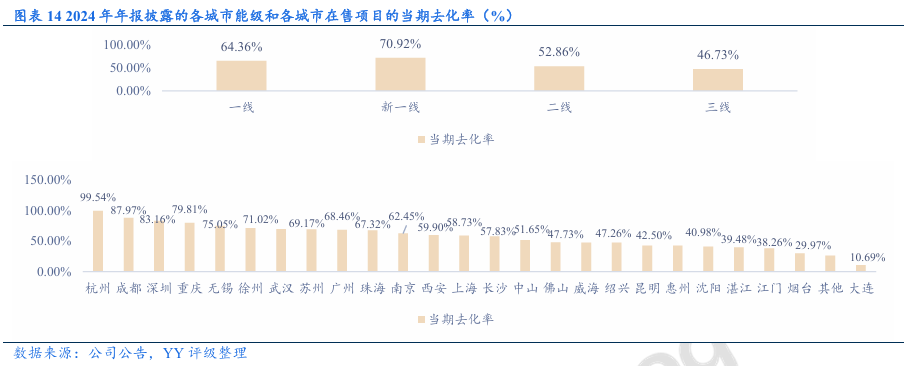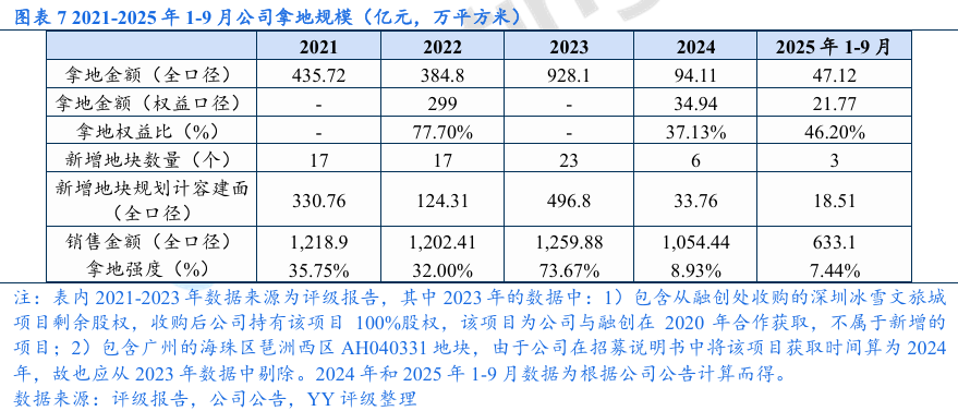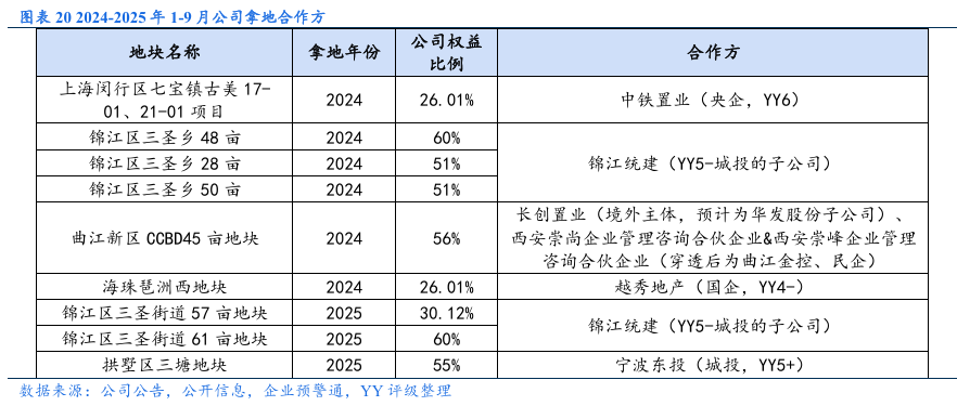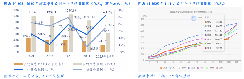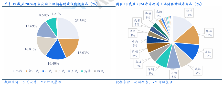 经营表现:拿地策略转变,2024年起公司拿地强度大幅下降,主力拿地城市由一线城市转为新一线城市。销售业绩方面,投资减速下高能级城市销售支撑力度减弱,2024年和2025年1-11月的全口径签约销售金额同比分别下滑16.31%和 17.96%,2024年销售金额城市分布中珠海重回第一、上海居第二,高能级城市中部分项目去化进度不理想。土储方面,新增项目中剩余未售部分能提供的销售金额有限,公司仍存在“补库存”需求;由于新增优质地块去化快,且近两年拿地强度下降,土储主要为历史存量地块,去化压力较大。合作风险方面,新增项目的合作方涉及部分弱央国企和城投,但整体风险可控;关注明股实债可能。