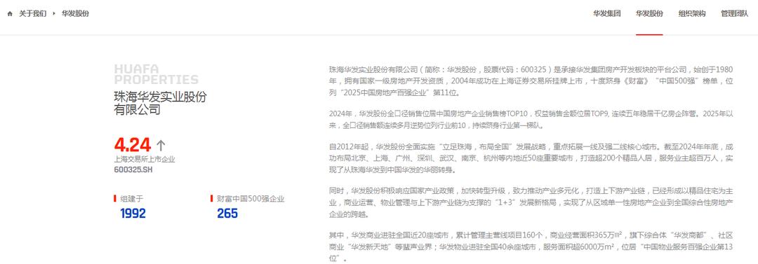 华发股份官网介绍,珠海华发实业股份有限公司(简称:华发股份,股票代码:600325)是承接华发集团房产开发板块的平台公司,始创于1980年,拥有国家一级房地产开发资质,2004年成功在上海证券交易所挂牌上市,十度跻身《财富》“中国500强”榜单,位列“2025中国房地产百强企业”第11位。