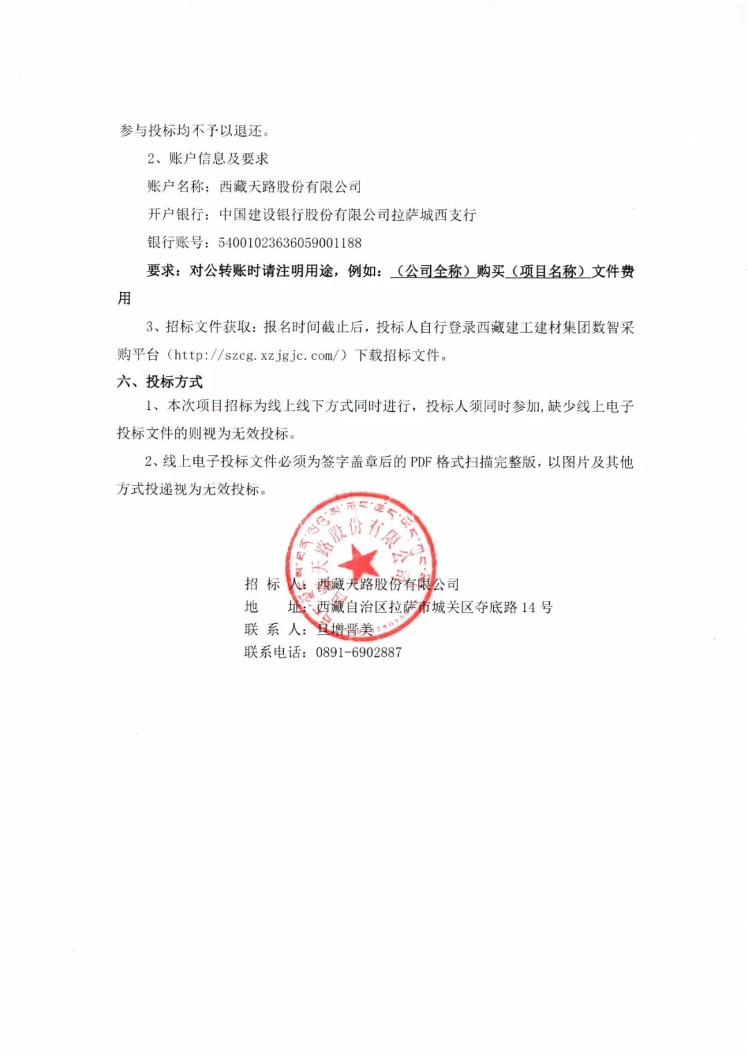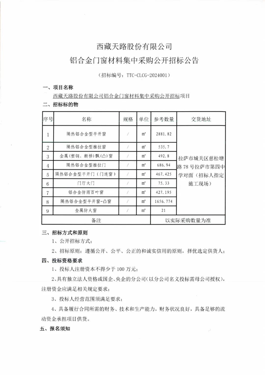西藏天路股份有限公司铝合金门窗材料集中采购公开招标公告