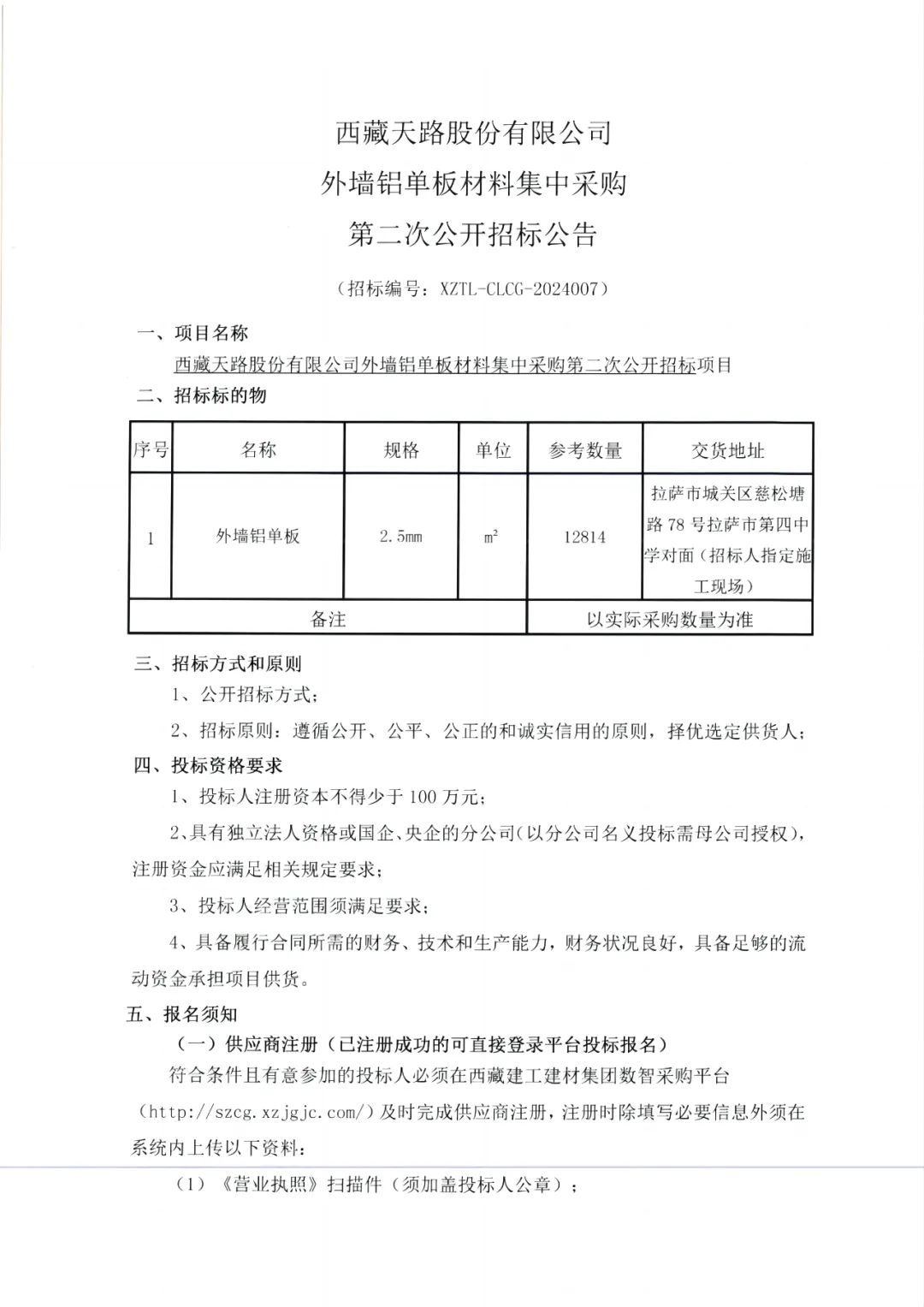 西藏天路股份有限公司外墙铝单板材料集中采购第二次公开招标公告