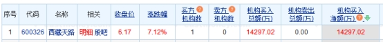 龙虎榜数据显示,买入西藏天路金额最大的前5名中,1家为机构专用席位。经统计,机构席位今日买入西藏天路净额为1.43亿元。