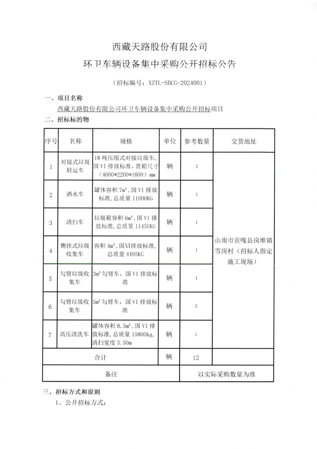 招标公告|西藏天路股份有限公司环卫车辆设备集中采购公开招标公告