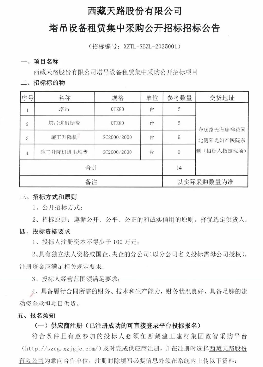 招标公告 | 西藏天路股份有限公司塔吊设备租赁集中采购公开招标公告
