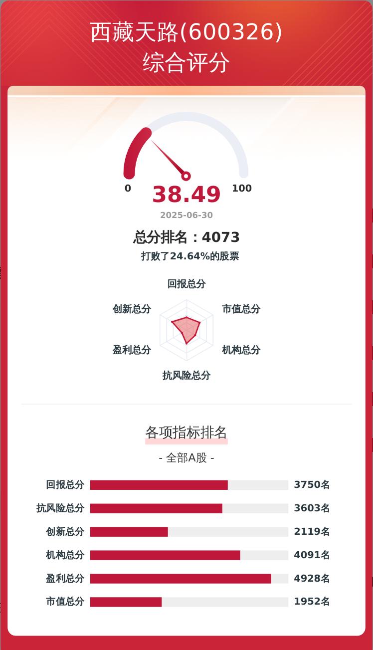 金融界上市公司研究院构建了一套上市公司韧性评价体系,从企业盈利、科技创新、股东回报、经营抗风险、市值表现及机构吸引力六个维度对企业进行量化评分,满分为100分。西藏天路的韧性评价总分为38.49分,在A股5405家可比上市公司中排名第4073位。