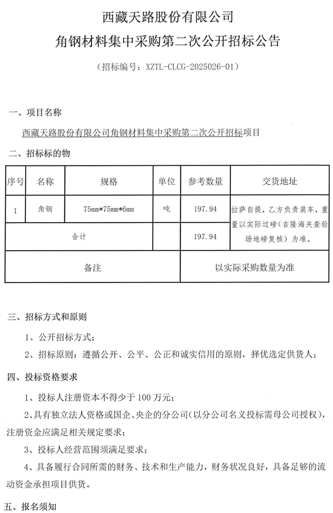 招标公告 | 西藏天路股份有限公司角钢材料集中采购第二次公开招标公告