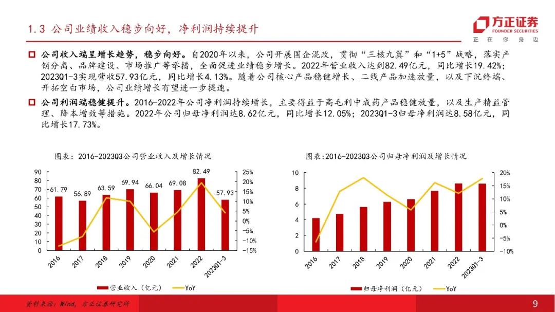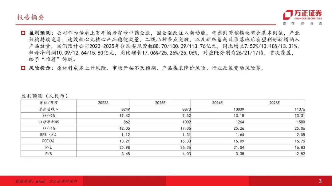 盈利预测:公司作为传承上百年的老字号中药企业,国企混改注入新动能,考虑到营销模块整合基本到位,产业架构持续完善,速效救心丸核心产品稳健放量,二线品种多点突破,以及新版基药目录落地后有望利好新增纳入产品放量,我们预计公司2023-2025年分别实现营收88.70/100.39/113.76亿元,同比增长7.52%/13.18%/13.31%,归母净利润10.09/12.64/15.80亿元,同比增长17.06%/25.26%/25.06%,对应PE分别为26/21/17倍,首次覆盖,给予“推荐”评级。