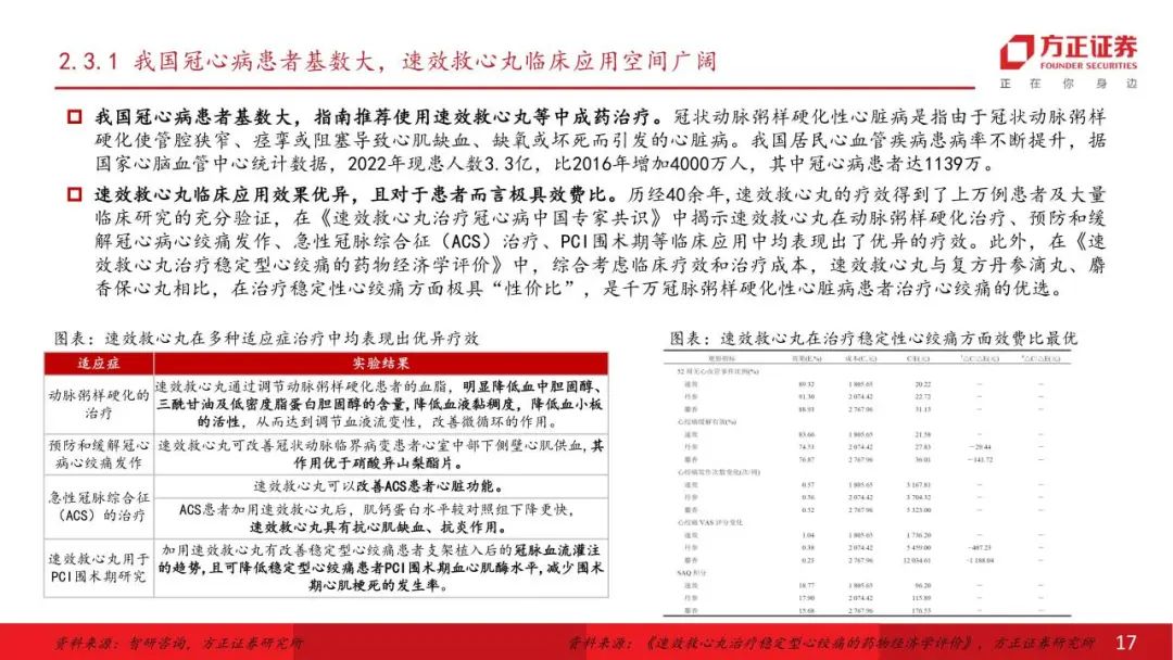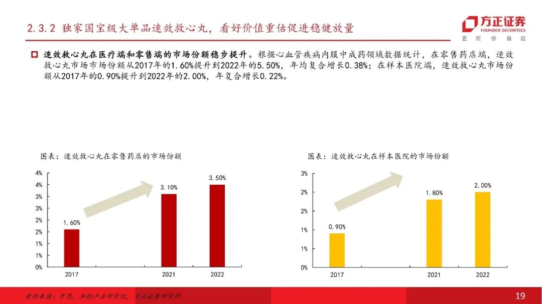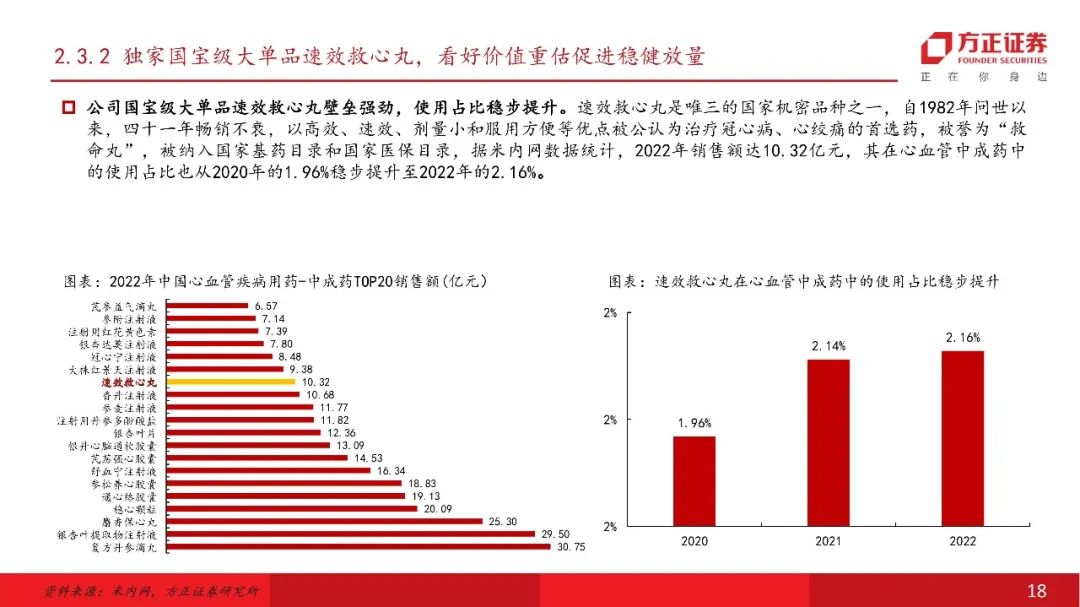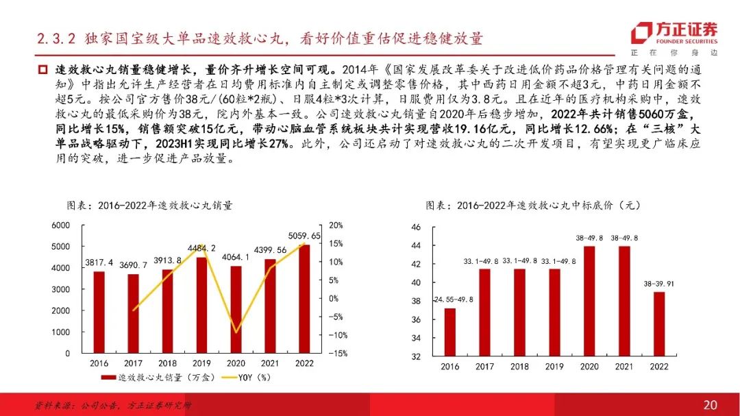 其中,速效救心丸为独家且国家机密品种,2022年销售额超15亿元,同比增长17.7%,随着人口老龄化的加剧,基于多年高效的市场推广,看好速效救心丸价格重估,保持稳健放量。通脉养心丸、京万红软膏、安宫牛黄丸、清咽滴丸、胃肠安丸、痹祺胶囊等二线产品也有望在各自销售平台专项推动以及二次开发促进下加速放量,快速成长为新的大单品。此外,在即将到来的基药目录调整中,公司其他未进入基药的品种若能新增进入,则有望为业绩带来可观的增量空间。