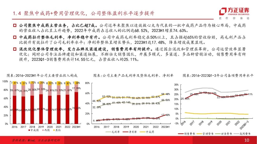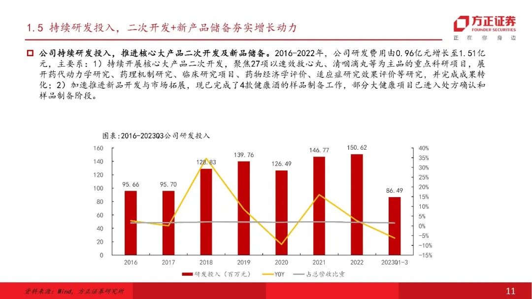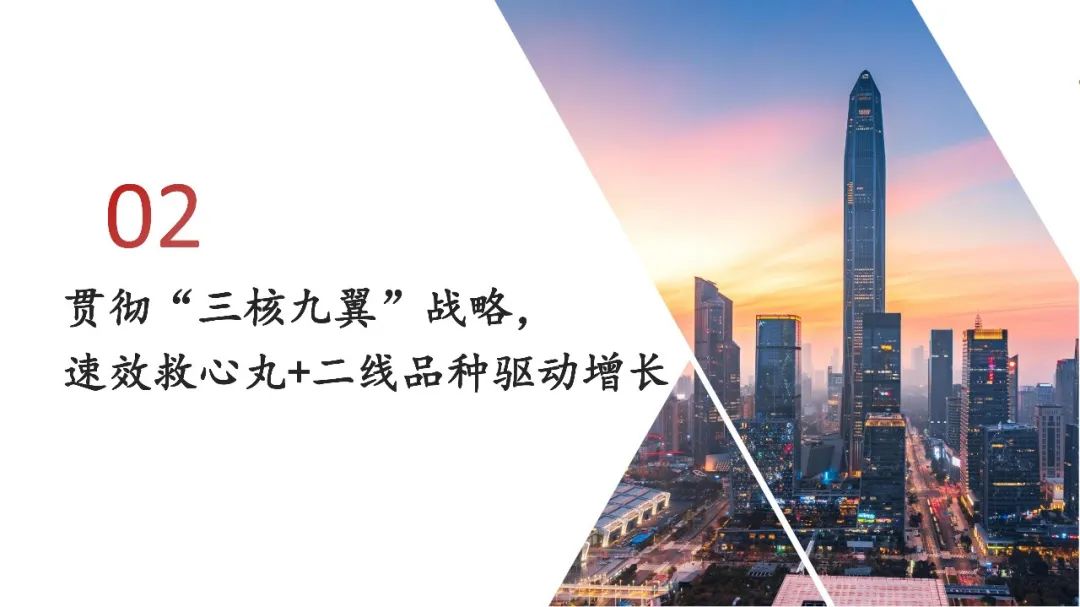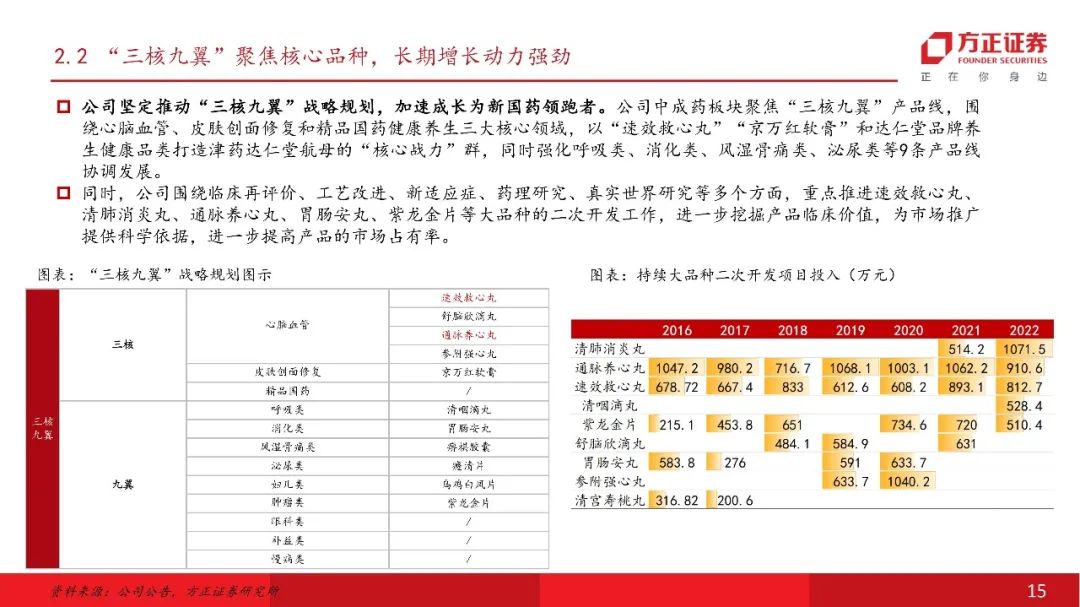 贯彻“三核九翼”战略,速效救心丸稳健放量,二线品种增量可期。公司产品储备丰富,目前拥有599个药品批准文号,其中114个中药独家品种,5个中药保护品种,1个国家机密品种,1个国家秘密品种。公司基于庞大的产品储备,稳步落实“三核九翼”战略规划,聚焦心脑血管、皮肤创面修复、精品国药健康养生3大核心,构建以速效救心丸为核心大单品以及京万红软膏、安宫牛黄丸等为代表的“核心战力”群,全面统筹价值链。