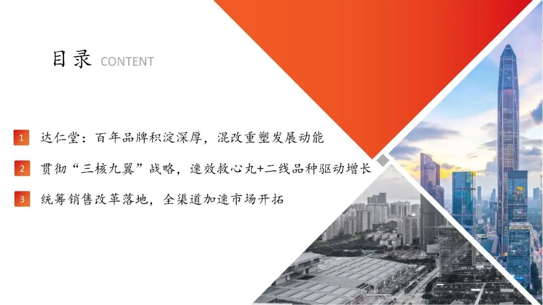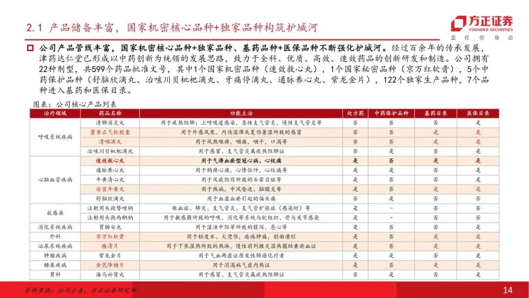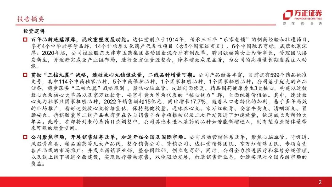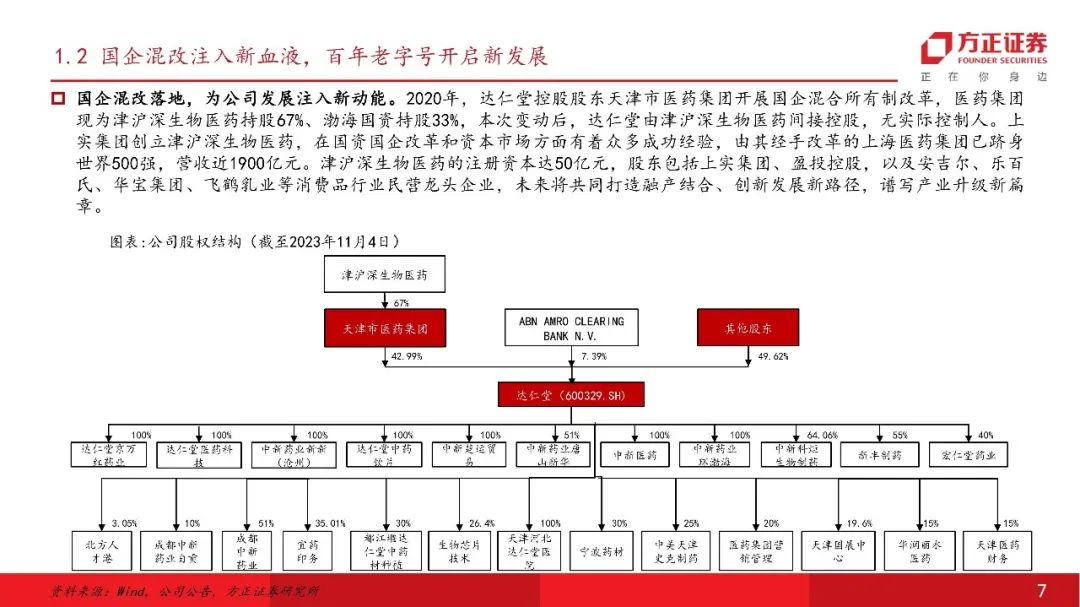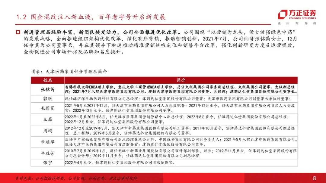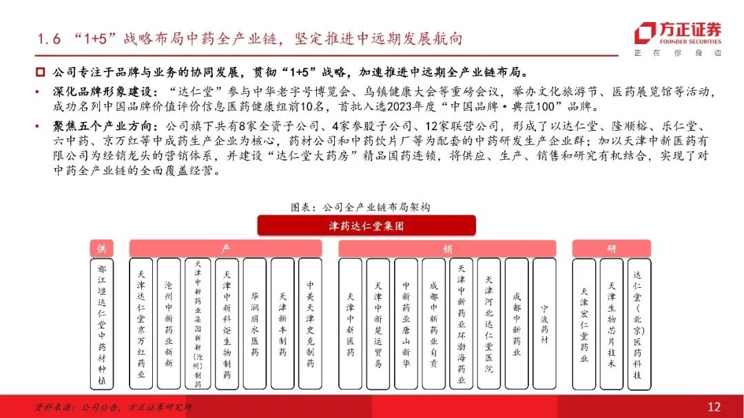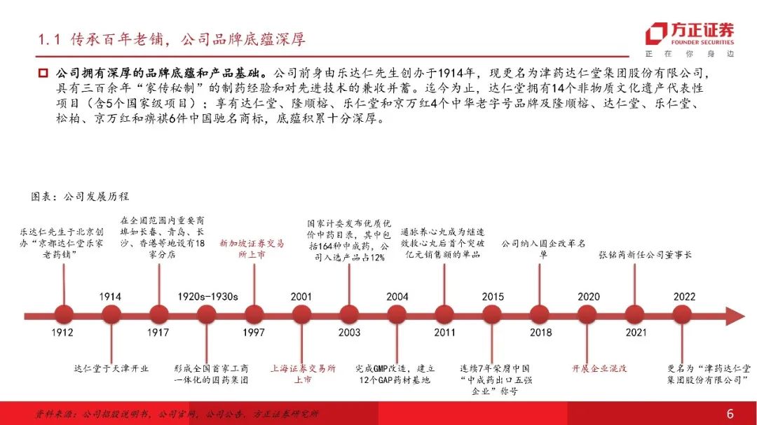 百年品牌底蕴深厚,混改重塑发展动能。达仁堂创立于1914年,传承三百年“乐家老铺”的制药经验和非遗药目,享有4个中华老字号品牌、14个非遗代表性项目(含5个国家级项目)、6个中国驰名商标,底蕴积累深厚。2020年起,公司控股股东天津市医药集团启动国企混改,任张铭芮女士为董事长,管理团队焕发新生,并逐渐完成全产业链布局,进行全方位资源整合,降本增效成果显著,为公司的高质量长期发展注入动能。